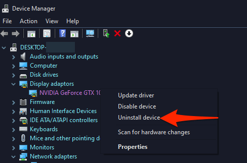 - On the Device Manager window that opens, select the arrow icon beside **Display adaptors**. * From the expanded Display adaptors menu, right-click your Nvidia graphics card and select **Uninstall device**.