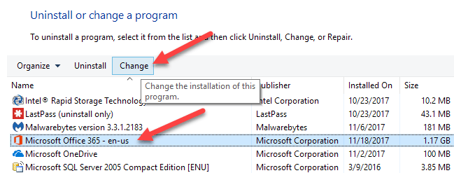 If none of that worked for you and Outlook is still not spell checking correctly, you can try to repair the installation. You can do this by going to Control Panel, Add/Remove Programs or Programs and Features, clicking on Microsoft Office and then clicking on Change.