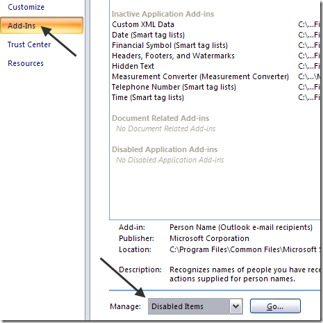Once you do that, you need to click on** Add-Ins** and then choose Disabled Items from the Manage drop down menu at the bottom. Then click the Go button.