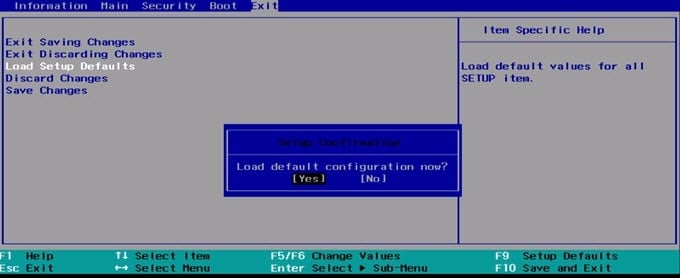 Now go to the Exit menu and select Load Setup Defaults. Finally, choose Exit saving changes.