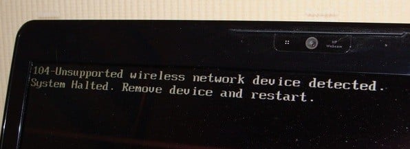 If you have an older HP computer, you may sometimes get the following error when booting up your computer: Error Message: 104-Unsupported wireless network device detected. System Halted. Remove device and restart.