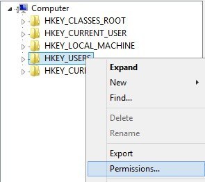 For registry entries, open regedit by going to Start and typing in regedit. Once you have it opened, you need to check the permissions for HKEY_USERS. Right-click on HKEY_USERS and click on Permissions.