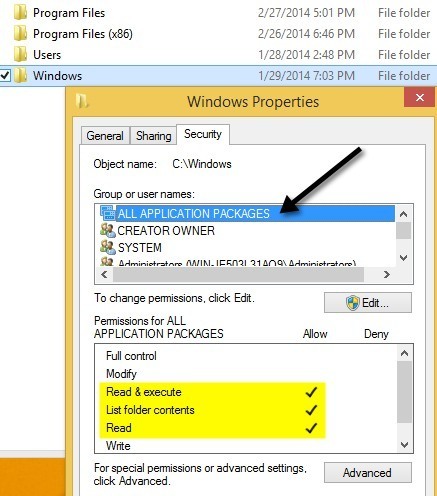 Once you have done this for the Windows directory, you need to do the same thing for C:\Users and C:\Program Files. For C:\Users, everything is the same except you give the All Application Packages group Full Control. Also, if you’re running 64-bit Windows, you’ll need to do this for C:\Program Files (x86) too. ## Fixing Registry Permissions
