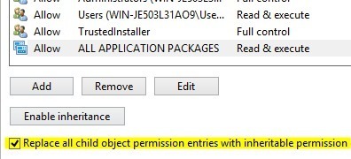 You’ll be brought back to the main permissions screen. Here you need to make sure to check the Replace all child object permission entries with inheritable permission entries from this object.