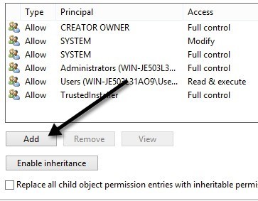 You then want to click the Add button. Note that if the Add button is grayed out, it probably means the files are all owned by TrustedInstaller. Read my previous post on how to change permissions so that you can gain full control over the files and folders.