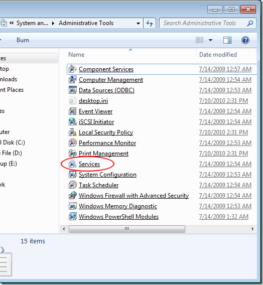 Click on Start and type Admin in the Search box. Press the Enter key and Windows 7 opens the Administrative Tools window. Click on Services.