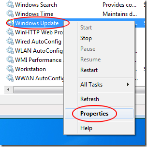 You should now be looking at the Services window. In the right hand pane, locate a service titled Windows Update. Right click on the Windows Update service and choose Properties from the menu.
