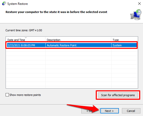 Pro Tip: Click the Scan for affected programs button to see a list of apps that’ll be deleted during the system restore process.