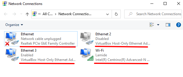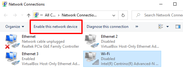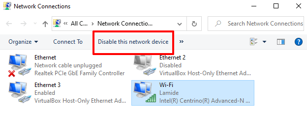 Select Wi-Fi (if you’re using a wireless connection) or Ethernet (for a wired/LAN connection) and click Disable this network device on the toolbar.