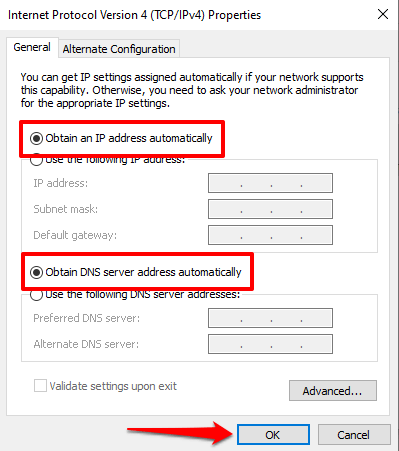 If the error persists and you still cannot access the internet, disable any manual IP address or DNS configuration assigned to your network adapters. Allowing Windows to automatically obtain IP and DNS server addresses for your connections can eliminate this error.