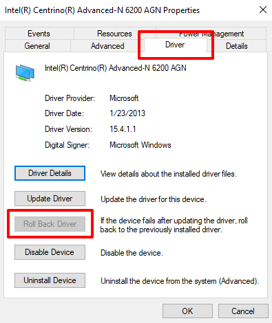 - Go to the Driver tab and click the Roll Back Driver button.
