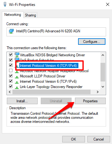 Select Internet Protocol Version 4 (TCP/IPv4) and click Properties.