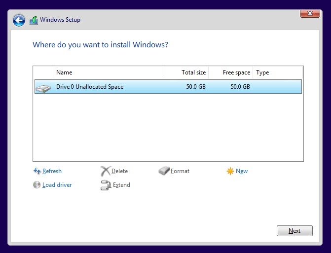 - Select **Next** and Windows will format the empty space correctly and create the appropriate partitions.