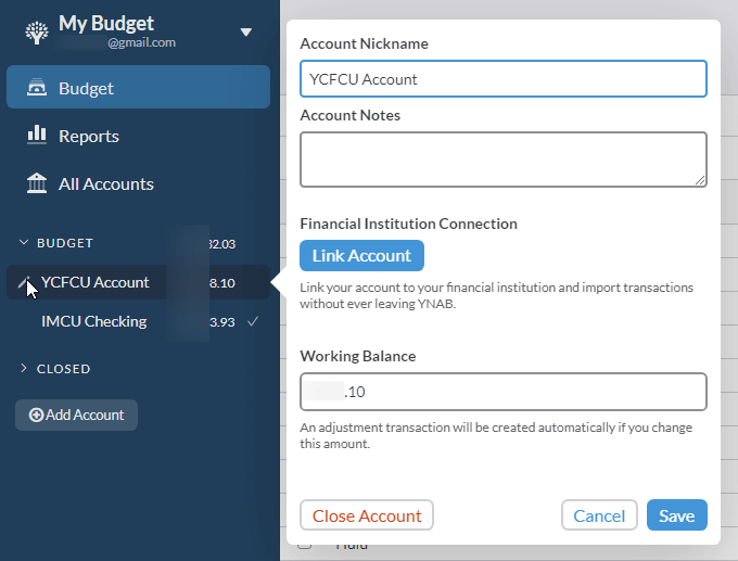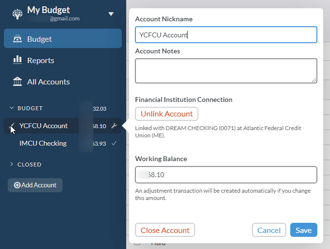 - This will open the account editing pop-up. Here, you can edit the account nickname, add any notes about the account, or adjust the account balance if YNAB isn’t getting an accurate number. In this case, since you want to fix YNAB not syncing with the account, select the Unlink Account button.