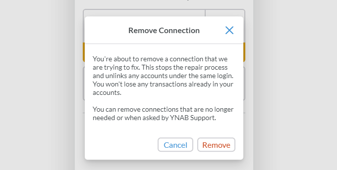 - This won’t remove the account from YNAB or delete the connection entirely. Instead, it removes the link that YNAB currently has related to this account. Once it’s unlinked, you’ll notice that the small wrench icon no longer appears to the right of the account name in your YNAB account.