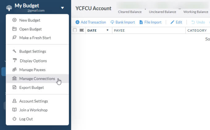 - Select the dropdown to the right of your email address at the upper left of the main YNAB window. Select Manage Connections from the menu.