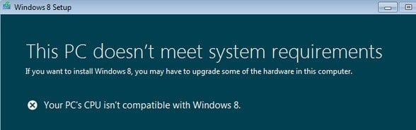 I’ve installed Windows 8/Windows 10 on a couple of machines lately to play around with it and it has installed without a problem on all machines except one. On an older Dell computer that I have, I get the following error message during setup: Your PC’s CPU isn’t compatible with Windows 8