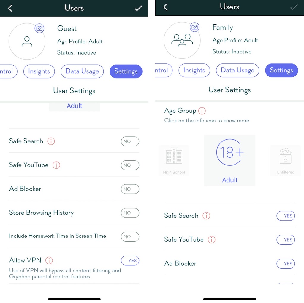 There are a variety of individual settings you can activate within User settings, too: * **Age Group: **Assign specific safety settings based on age. Options range from Toddler (blocks all except specified safe sites) to Unfiltered (unrestricted access.)