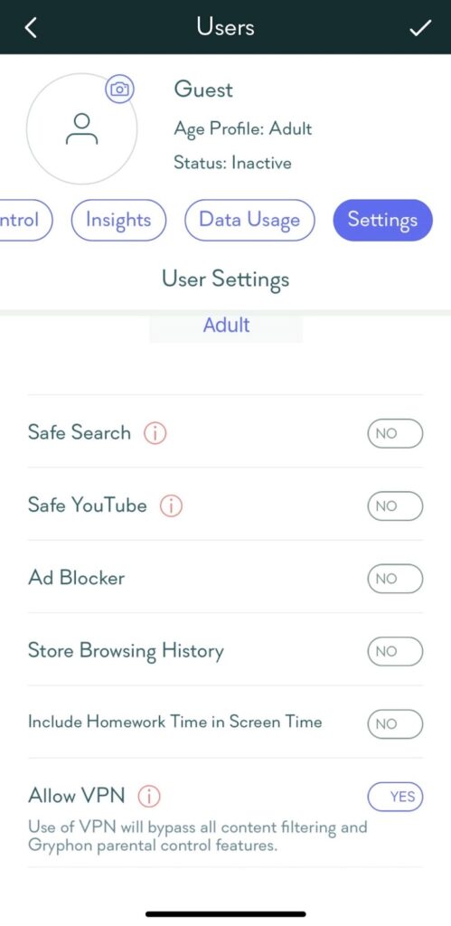 - **Allow VPN: **If you choose to allow a user to use a VPN, it can bypass Gryphon’s filtering and parental control features.