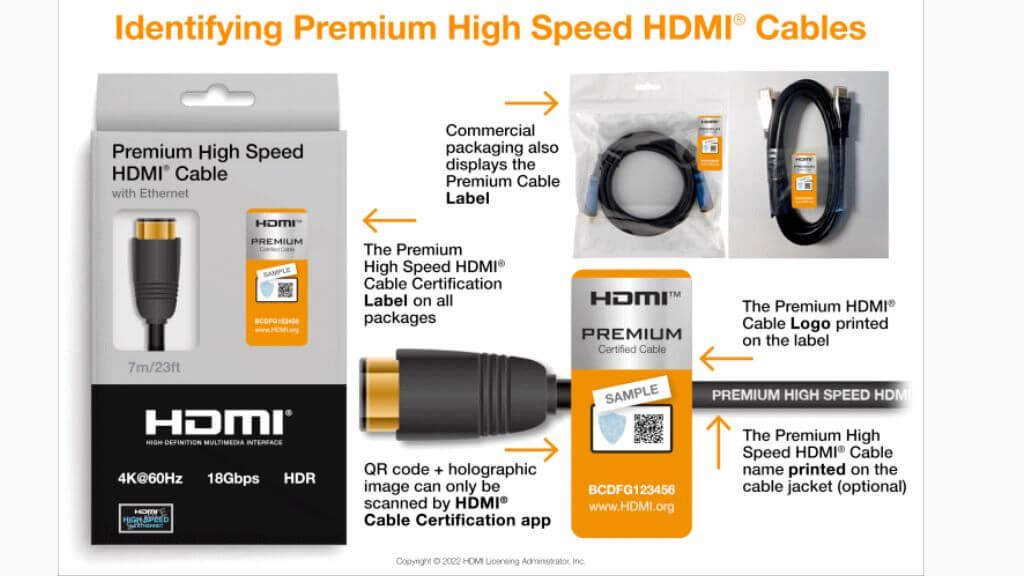 Premium High-Speed HDMI Cables are tested and certified to reliably handle the total 18Gbps bandwidth provided by HDMI 2.0. They support advanced HDMI 2.0 features such as 4K resolution at 60Hz, HDR (High Dynamic Range), expanded color spaces like BT.2020, and even up to 32 audio channels for immersive multi-dimensional audio. These cables also come with an authentication label to guard against counterfeit cables that might not deliver the promised performance.