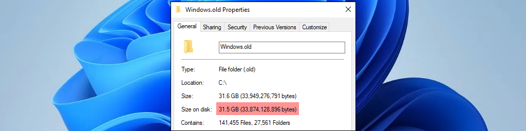 If you upgraded from Windows 10 to Windows 11 through Windows Update, try Disk Cleanup with the option to remove System Restore and Shadow Copies. Be aware that removing restore points and Shadow Copies could make recovering files or Windows impossible. However, using Disk Cleanup could free hundreds of MBs or even several GBs of drive space.