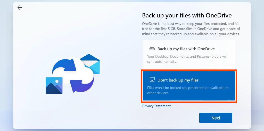 The one point in the setup that can make a difference is when Windows 11 gets to the **Back up your files with OneDrive **settings. Choose Don’t back up my files to prevent OneDrive from syncing. If you sync OneDrive on install, it could use hundreds of GBs of your drive or more.