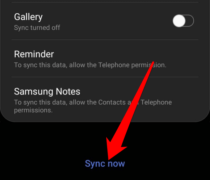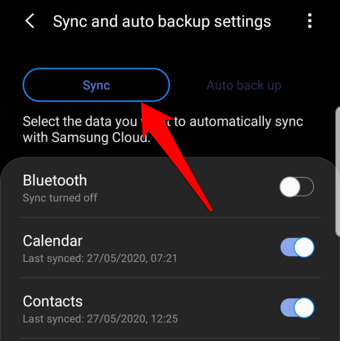 - Under the **Sync** tab, toggle the switches for the data you want to sync continuously to On.