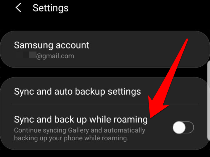 - Toggle the **Sync and backup while roaming** switch to allow syncing of your Gallery and automatic backing up of your phone over a cellular network while roaming. If you want to conserve your mobile data, you can disable this option to allow syncing only over WiFi.