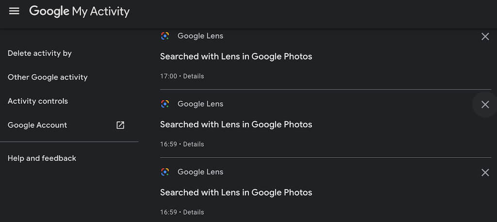 Your entire search history is stored in your Google account. That includes your Google Lens activity and search results. You can find the list of your Google Lens searches on My Activity page on Google.