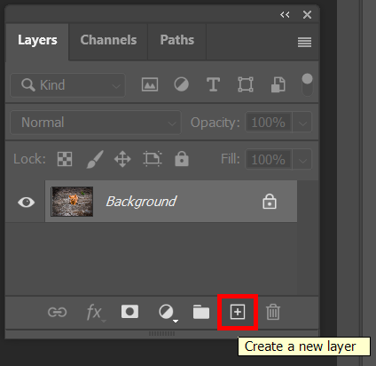- Create a new layer using the button at the bottom of the Layers panel or by selecting Layer > New >** Layer **or by using the keyboard shortcut **Shift **+ **Ctrl **+ N.