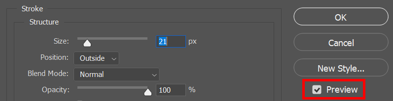 - With Stroke selected in the Layer Style dialog box, you can then adjust the appearance of the text outlines. Set the thickness of the outline by entering a number of pixels or by using the **Size **slider. * Set the **Position** of the stroke to Inside, Outside, or Center. If you have the **Preview** box checked, you’ll see the effects of your choices on your document.