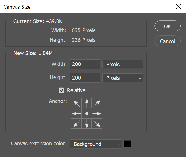 - Now we’ll make the canvas larger. Select **Image** > **Canvas Size**. You want to increase the size of the canvas to accommodate the border you want to add. Make sure the **Relative** box is checked and the anchor is set to the middle of the grid. Then enter the number of pixels by which you want to increase the canvas. Remember, half of the pixels will be added to each edge of the canvas, so if you want a border that’s 100 pixels wide, you’ll need to increase the width and height of the canvas by 200 pixels each.