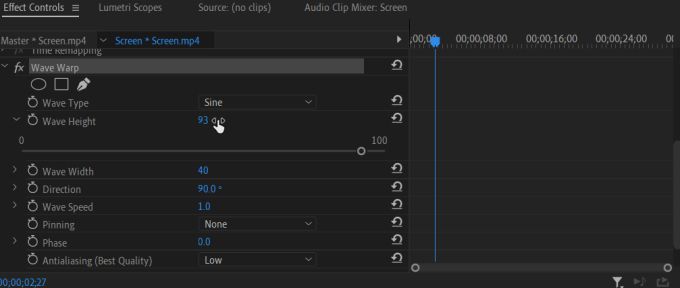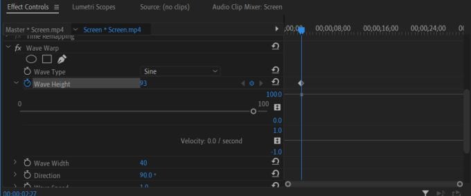 On this timeline is where you can edit your keyframes. As an example, let’s edit a wave warp effect into a clip. After placing the effect on the clip and going into Effect Controls, you would choose the Wave Warp dropdown.