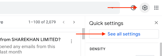 - Open the Gmail website in your browser. From the Inbox, click the Settings icon and choose the See All Settings option.