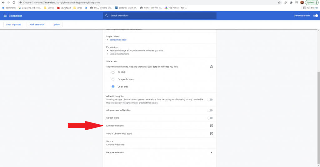 - Scroll down the options and select **Extension options.**