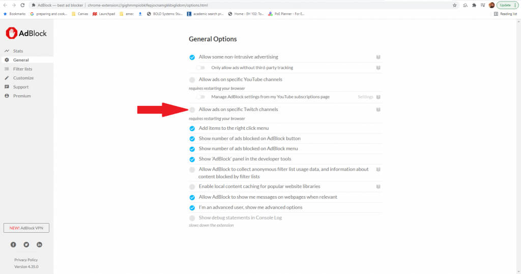 This step applies strictly to the Adblock extension itself, and only for Chrome, Firefox, and Edge. The Adblock extension allows you to set specific guidelines regarding which ads are blocked and which ones are not. Making sure Twitch is included is important.