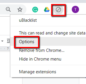 To begin, locate the uBlacklist icon in your toolbar. Right-click on it and choose Options.