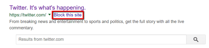 For example, I did a search for “twitter”. After I installed the extension, I see a **Block this site **option next to the search results.