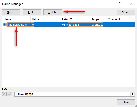 - In the Name Manager pop-up box, select the name you want to change. * Select the name. * Select Delete then press OK.