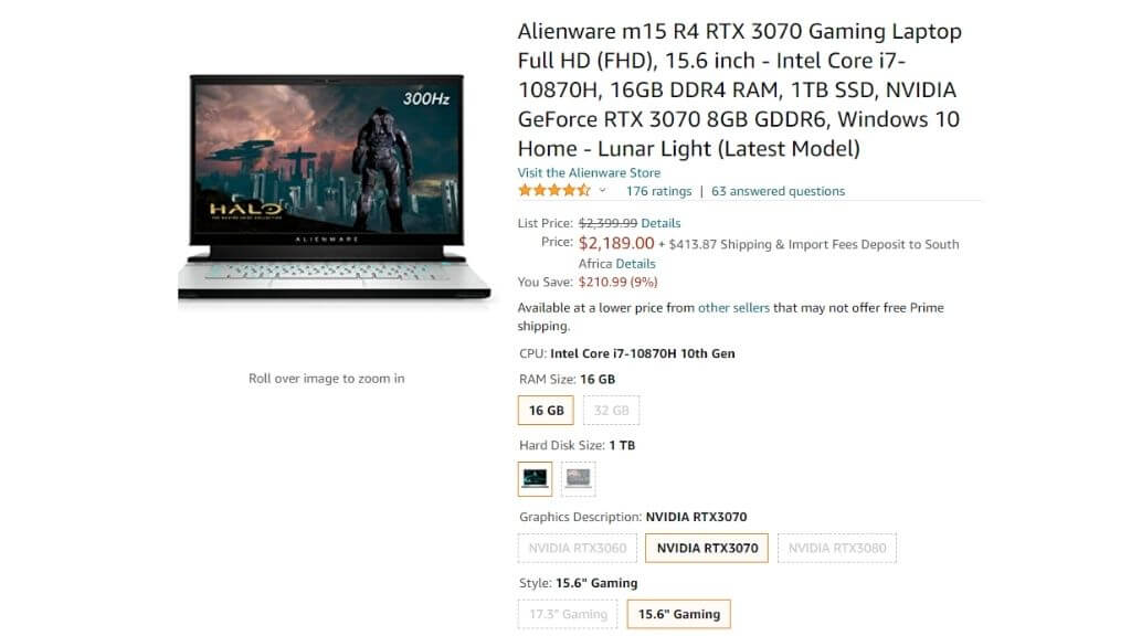 The Amazon page for the Alienware m15 lets you choose your specifications