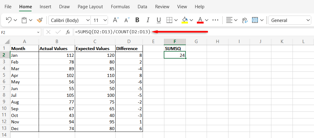 - Select a new cell and type the following syntax: “=SUMSQ(D2:D13/COUNT(D2:D13)”. Replace the cells in the formula with the correct cells from your Excel spreadsheet. The final result in this cell is your MSE.