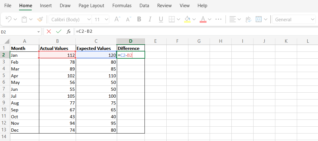- Create a new column in Column D called “Difference”. This will represent the difference between the expected and actual values.