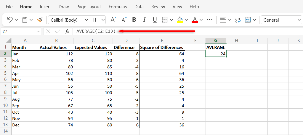 - Select a new cell and calculate the average value of Column E. This will return the mean of the squared values that you previously calculated. To do so, type “=AVERAGE(E2:E12)” and press Enter. Make sure to replace the cells with the cells you used in your worksheet. The resulting data value is your MSE.