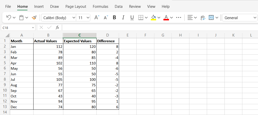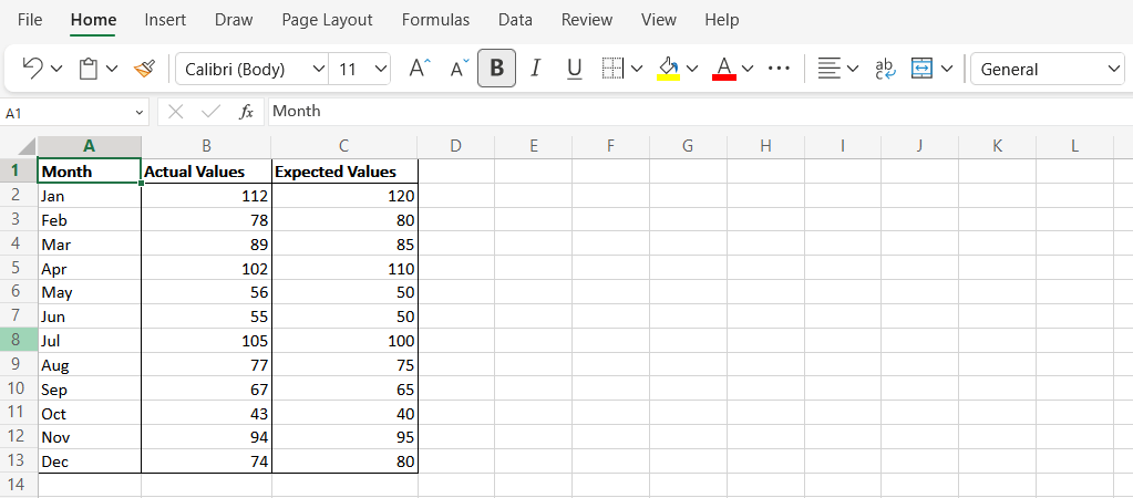 In this simplified example, we’ll look at fictional sales values for each month (Column A). The estimated values are represented in Column B and the actual values in Column C.