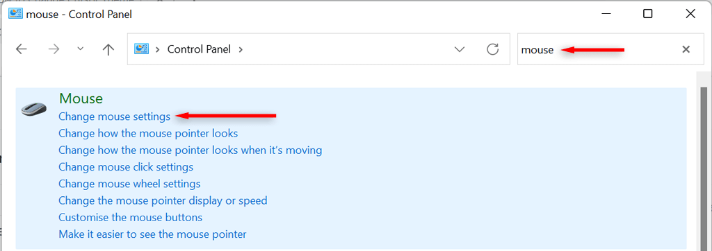 - Type Mouse into the Control Panel search bar. Select Change Mouse Settings.