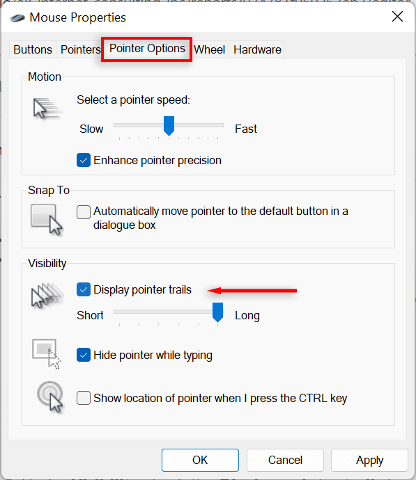 - Navigate to the pointer options tab. * Under Visibility check the Display pointer trails box.
