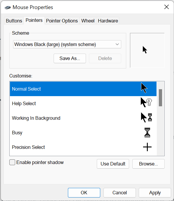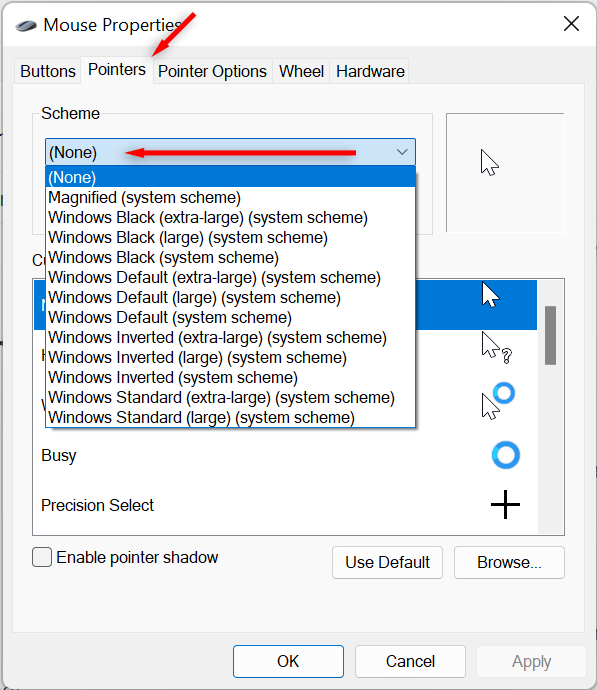 - In the mouse properties window, navigate to the Pointerstab and select the drop-down menu under the Scheme section. Choose a cursor scheme, then press OK to save your choice.