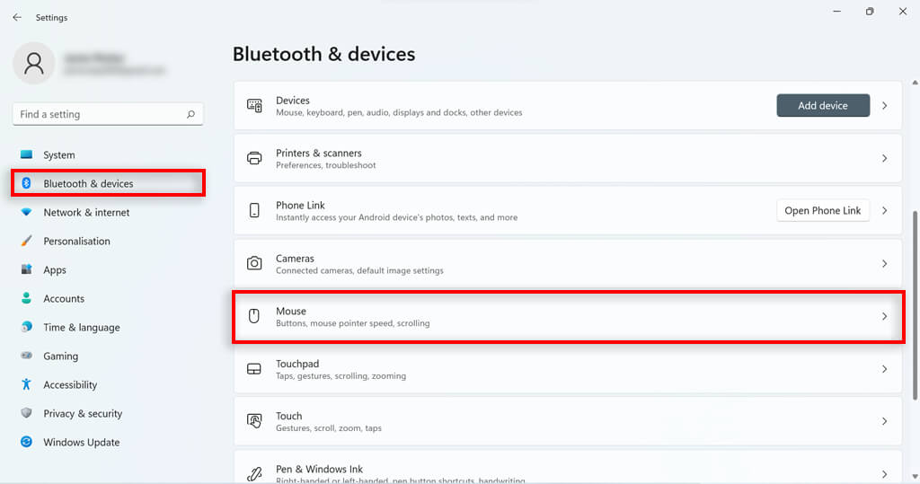 - Open Windows Settings by pressing the Windows key + I. * Select Bluetooth & Devices from the left sidebar. Scroll down and Select Mouse.