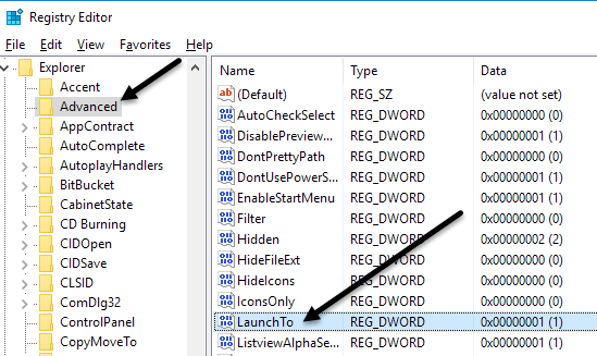 On the right hand side, look for a DWORD key named Launch To. 1 means This PC and 2 means Quick Access.