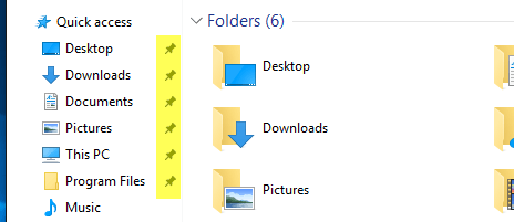 If you don’t like any of the two options above, you do have one other choice in Windows 10. You could use the new pinned folders feature that is associated with Quick Access. When you open Explorer, you’ll see a pin icon next to several folders under Quick Access.